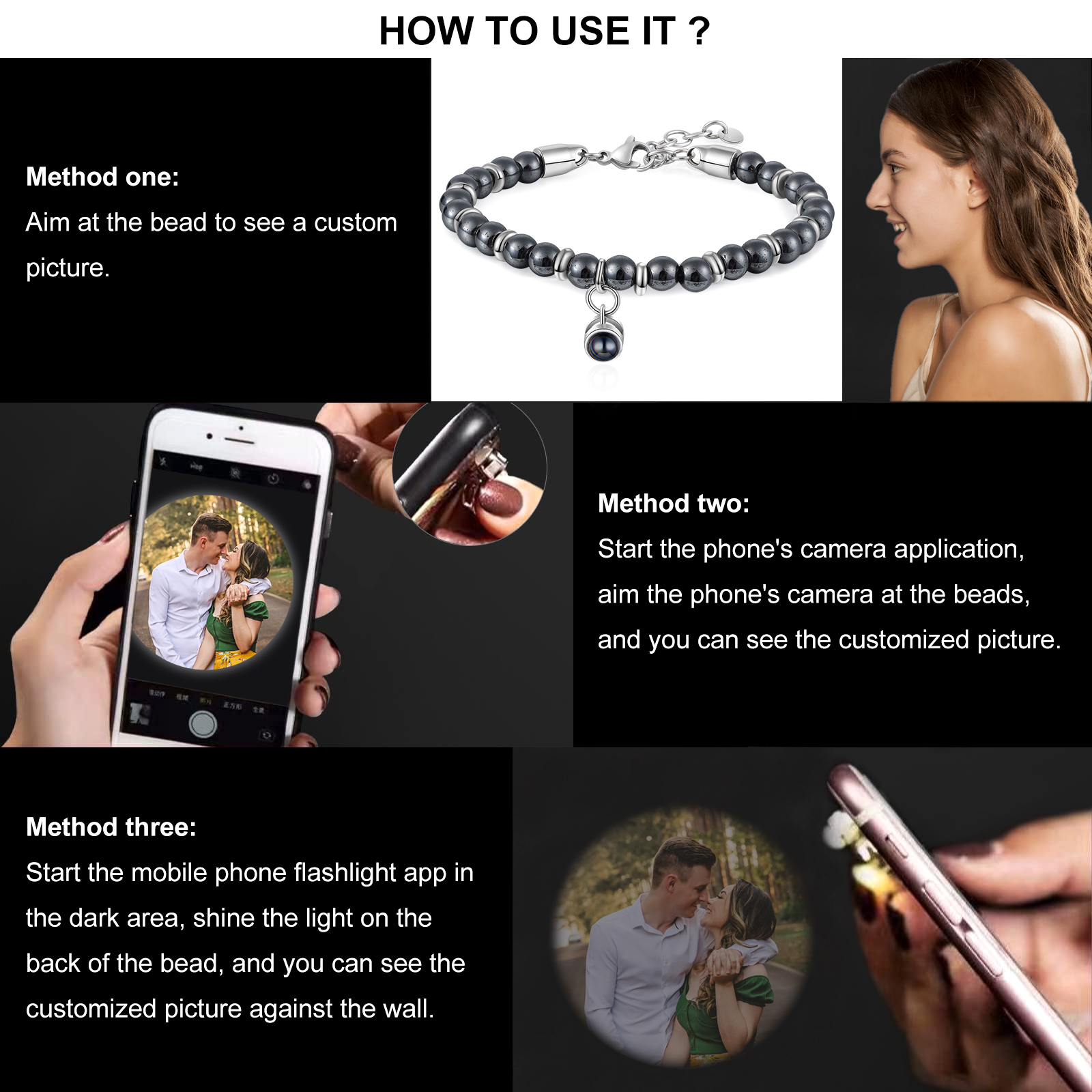 • A Picture Inside – Each bracelet has a custom picture inside. You can upload any picture that you like. The clearer the uploaded photo, the better the effect. Look inside or use your phone's camera to reveal the picture.