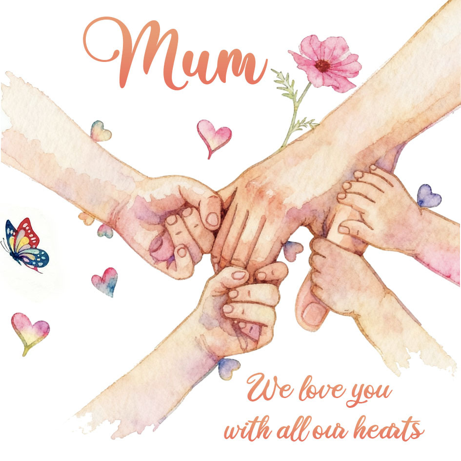 Celebrate the bond between a mum and her children with this heartfelt personalised print. Featuring a delicate watercolour illustration of hands linked together, butterflies and pastel hearts, it’s a touching way to say “I love you with all my heart” or “We love you with all our hearts” from one child or the whole family.