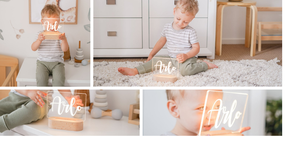Our made to order night lights engraved with your child's name will be the perfect addition to your little one's room. The wooden LED light base has been made to create a soft glow providing a warm intimate atmosphere, this will help your child feel relaxed and safe at bedtime and fall asleep quickly. Our night lights can be full customised with any name or text etched into your plaque which will create a unique bedside companion for years to come! You can rest assured that you will receive a high-quality product including your personalised acrylic plaque and plastic base but keep in mind that this is not a toy and is for decoration only.