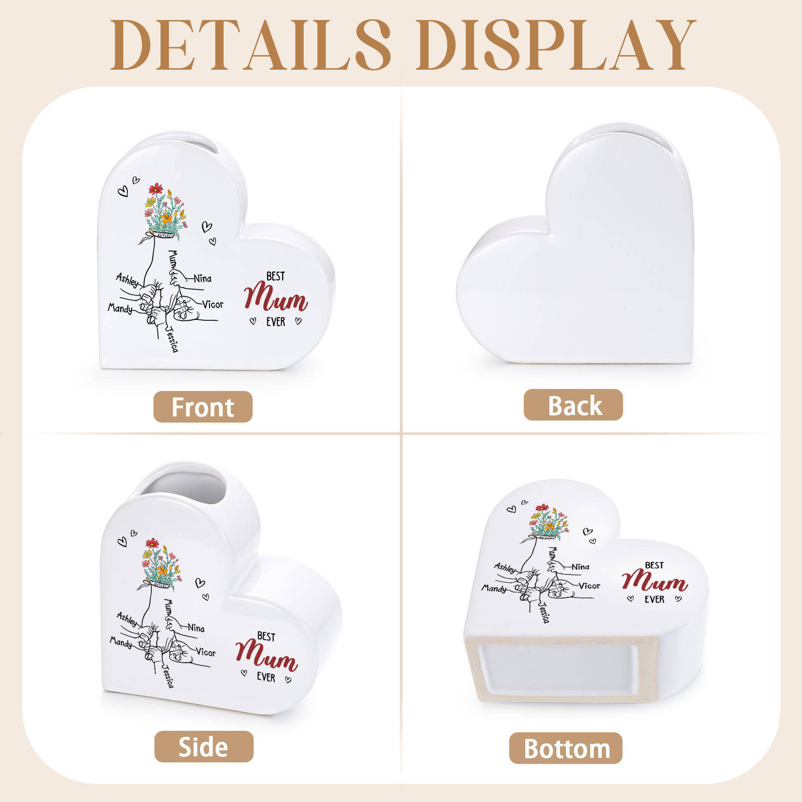 Keywords: personalised mum vase, Best Mum Ever gift, custom name flower vase, sentimental Mother’s Day present, ceramic heart vase, gift for mum from children, meaningful home décor gift
